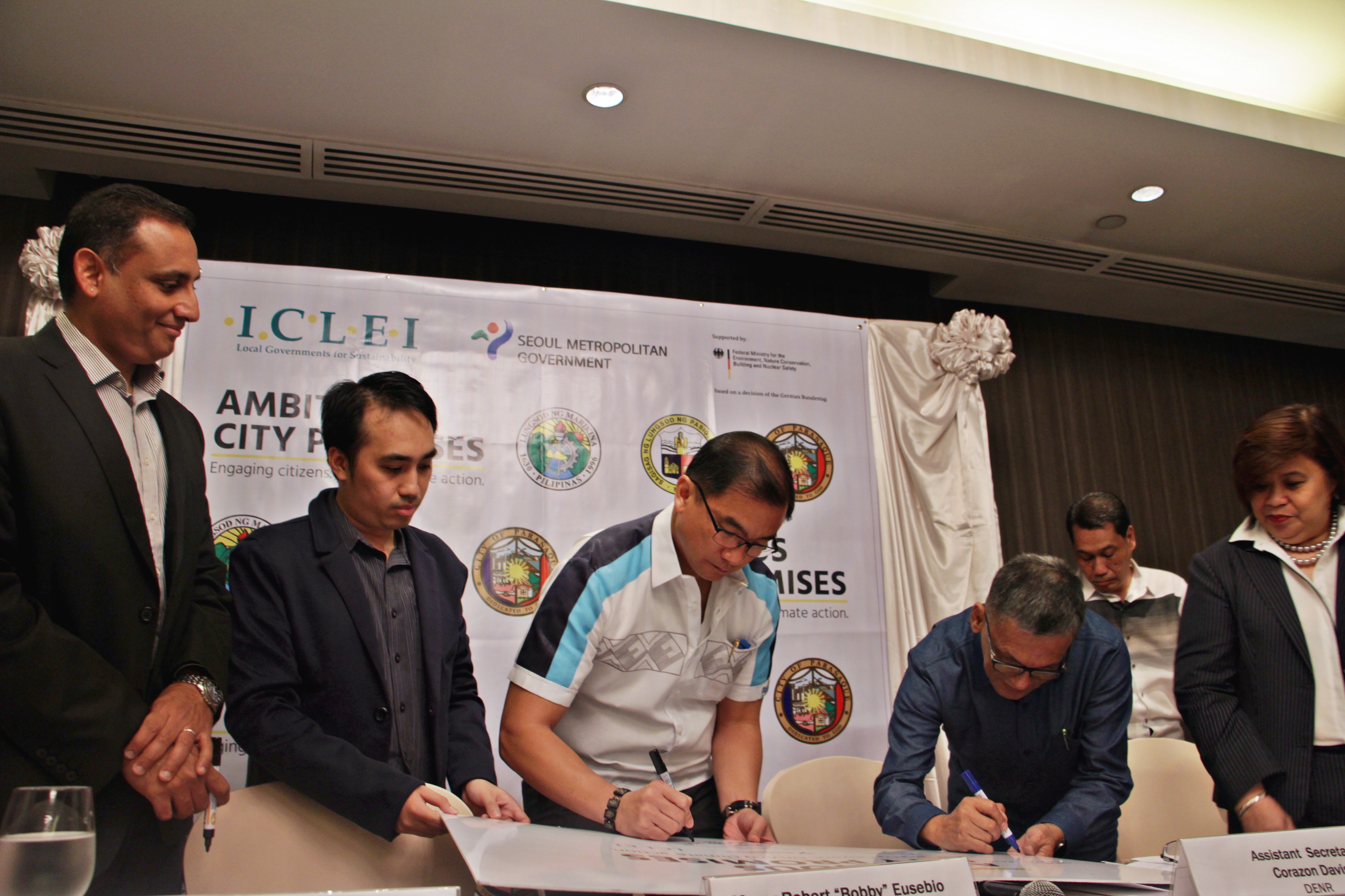 (L-R) Mr. Ranell Martin Dedicatoria of ICLEI SEAS, Mr. Sunandan Tiwari of ICLEI World Secretariat, Pasig City Mayor Bobby Eusebio, Parañaque City Environment and Natural Resources Office Assistant Head Mr. Isabelo Mojica, Jr., Department of Environment and Natural Resources Assistant Secretary for Policy and Planning Service Corazon Davis, and Marikina Planning Officer Mr. Jun Aguilar signed the Ceremonial Commitment Board for the Ambitious City Promises project.