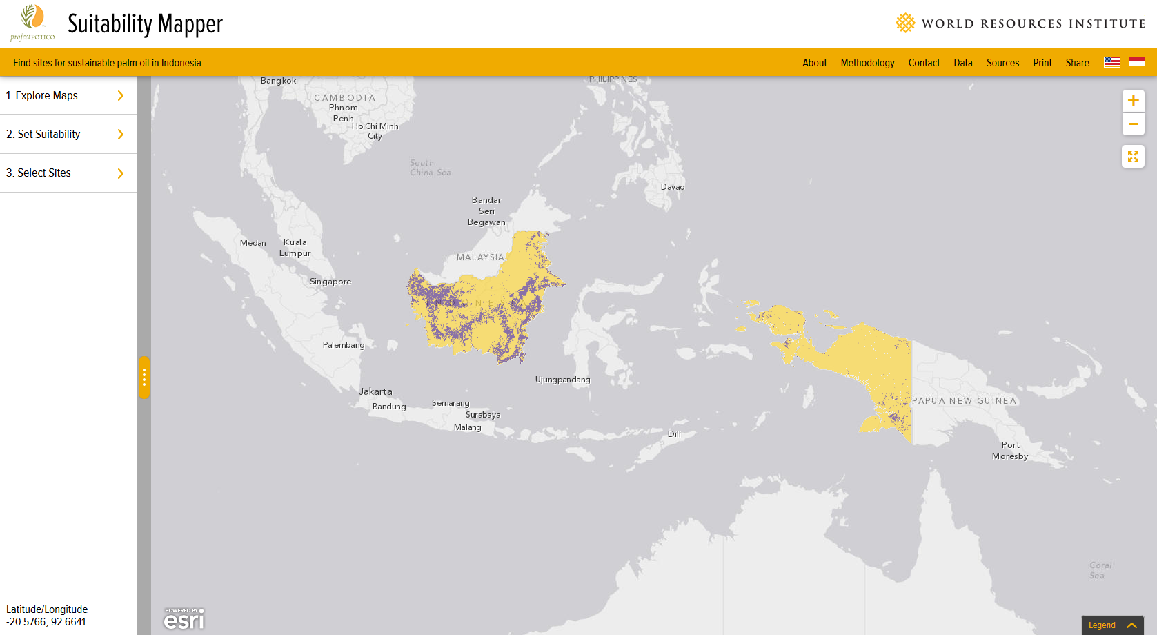 The Suitability Mapper enables users to identify potentially suitable sites for sustainable palm oil production in Kalimantan and Papua, Indonesia.