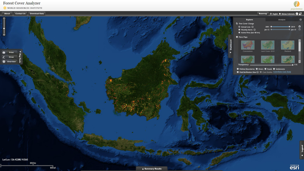 The Forest Cover Analyzer enables users to assess forest cover change and risks related to sustainable palm oil production in areas of their choice in Kalimantan, Indonesia.