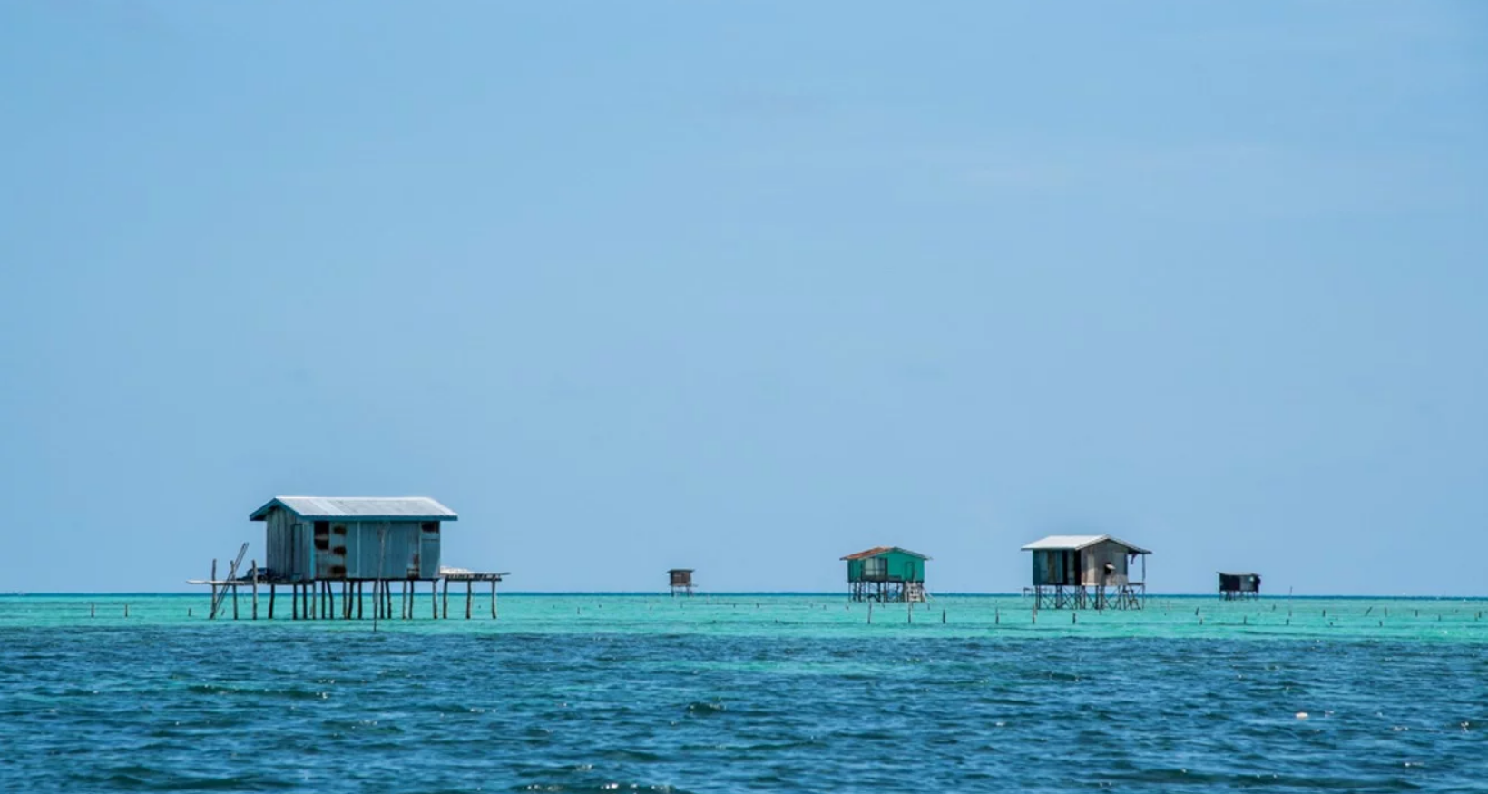 Stilt shacks are used as sea-cucumber processing factories off the coast of Tigabu. Picture: Ben Blackledge