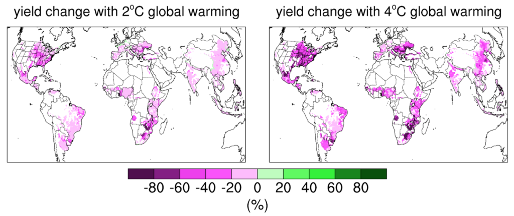You can see this in the maps below, which show projected corn yield changes under 2°C (left) and 4°C (right) of warming. The shading shows yield gains (green) and declines (purple).