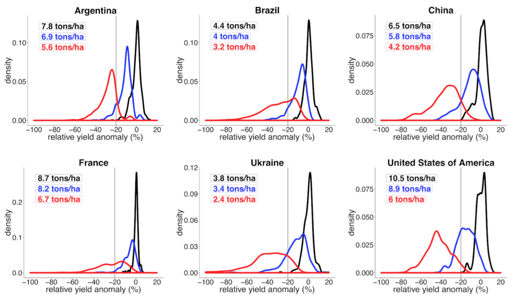 But these kind of losses become increasingly likely in a warmer climate. This is illustrated in the charts below. They show the probability of different yield levels for the six largest corn producing countries under today’s climate (black line), 2°C of warming (blue) and 4°C of warming (red).