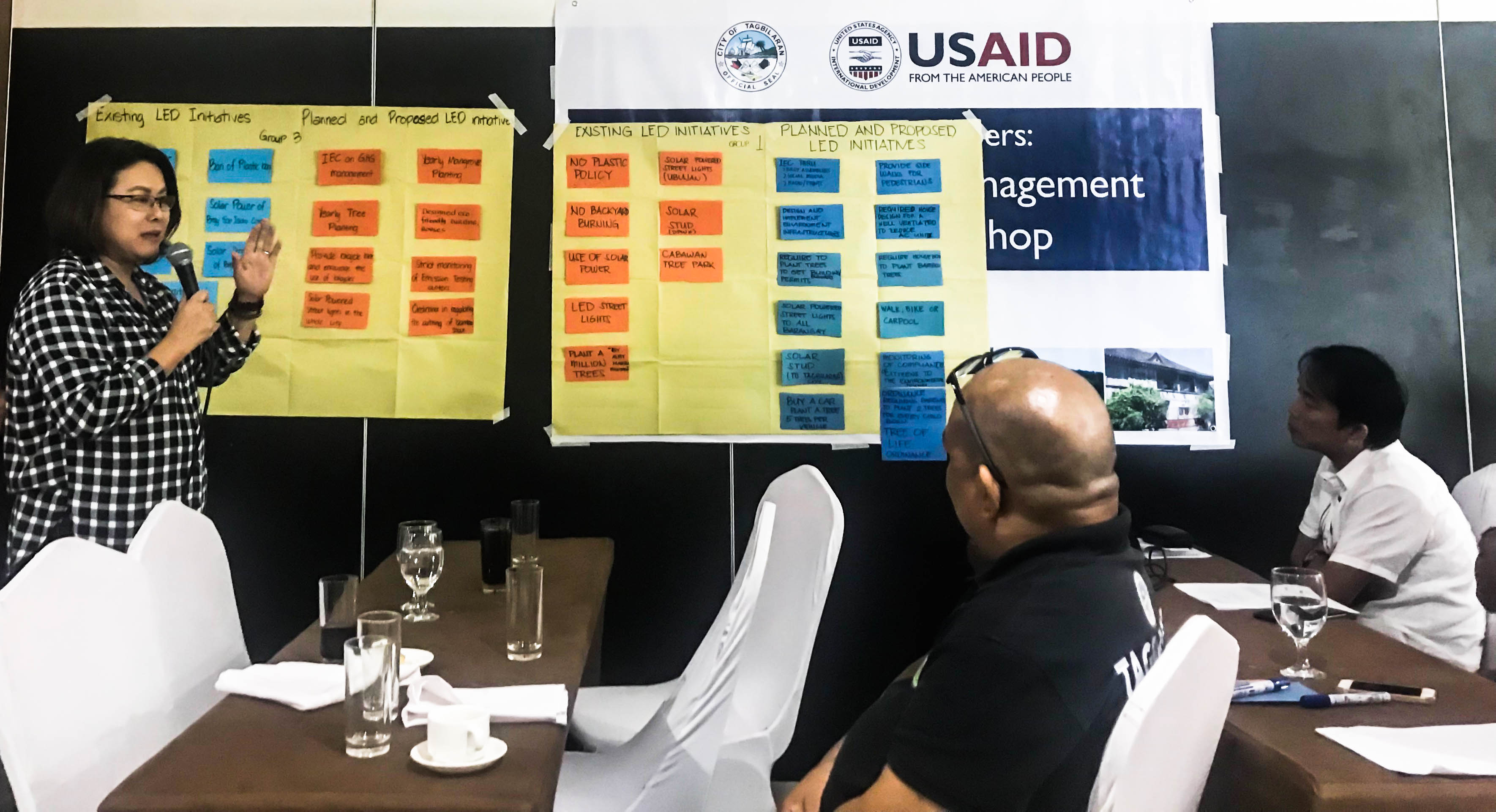 Twenty-three participants from the City Government of Tagbilaran, Bohol Chamber of Commerce and Industry and Department of Education participated in the workshop. The activity involved identifying of existing low emission development initiatives such as making use of energy-efficient bulb for street lights and proposed LED initiatives, for example, providing safe sidewalks and bicycle lanes.