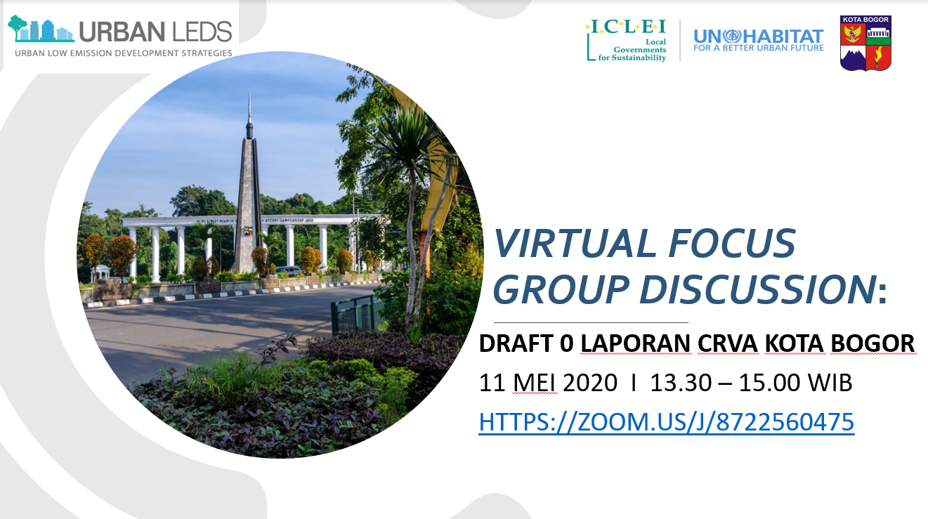 Jakarta, Indonesia – ICLEI Southeast Asia (ICLEI SEAS) in partnership with the Government of Bogor City held virtual climate risk and vulnerability assessment (CRVA) focus group discussion series, respectively on 11 and 20 May 2020. The discussions aimed to strengthen the substance of technical, social, and economic aspects that are inline with the national guideline, namely “Guideline of Climate Vulnerable, Risk and Impact” and “Guideline of the Development of Climate Change Adaptation Action”. The discussion also shed light on how the city identifies strategies and effective steps in mainstreaming selected adaptation options into city development planning and budgeting.