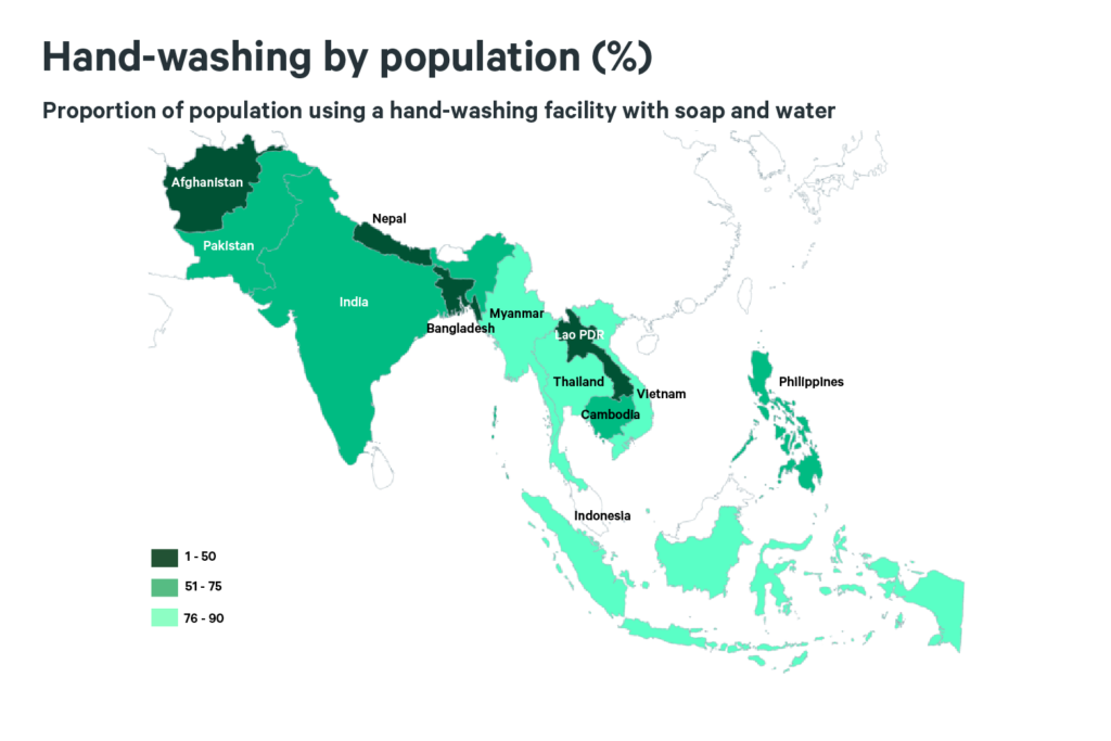 While the percentage of the population with handwashing facilities in Southeast Asia is higher than in many places – between 66 to 86% – countries in South Asia lag way behind, with numbers ranging from only 35 to 60%. Gross inequalities in water access persist between and within these countries, with rural areas and urban slums trailing far behind.