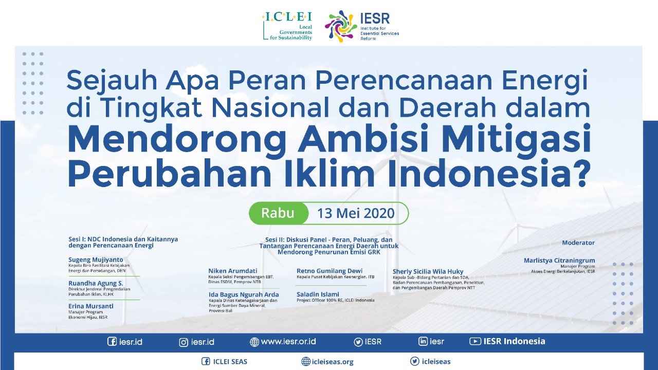 Jakarta, Indonesia – ICLEI Indonesia and the Institute for Essential Services Reform (IESR) hosted an online discussion on 13 June 2020 to discuss the role of energy planning to achieve Indonesia’s Nationally Determined Contribution. Indonesia aims to reduce its greenhouse gas emissions by 41% by 2030 with international support.