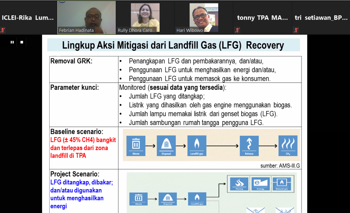 Mr. Febrian Hadinata, national solid waste management expert explains the scope and the applicability of the LFG Recovery Methodology as well the baseline and project scenarios.