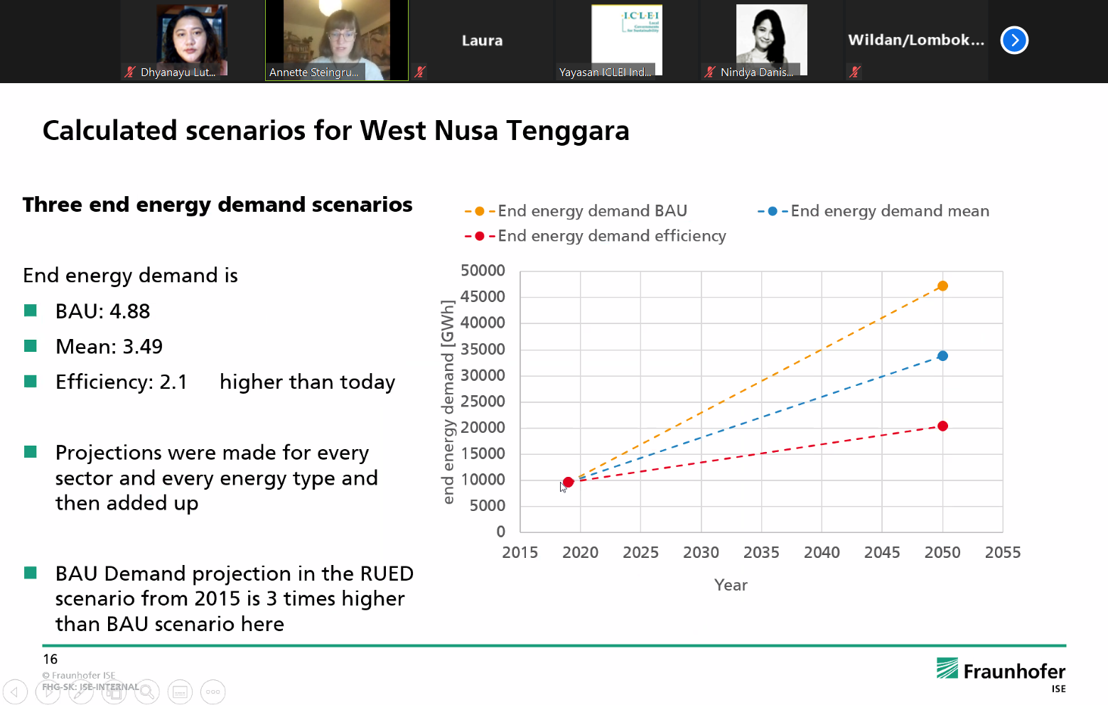 Scaling-up an ambitious renewable energy target requires the evaluation of its feasibility supported by technical energy modelling. In cooperation with Fraunhofer ISE, future energy scenarios exhibiting sustainable development in the region were evaluated and modelled based on data collected between August and November 2020. In the workshop, Dr. Annete Streingube shared the initial result of energy modeling.  Different scenarios are simulated by considering multiple energy demand projections, the possibility of connecting Lombok and Sumbawa islands’ energy system, and fuel price conditions.