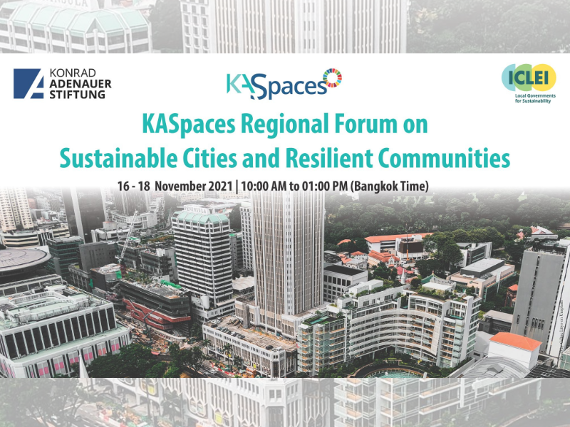 ICLEI – Local Governments for Sustainability South Asia, ICLEI – Local Governments for Sustainability South East Asia, and the Konrad Adenauer Stiftung (KAS) Singapore are jointly organizing the KASpaces Regional Webinar on Sustainable Cities and Resilient Communities from 16-18 November 2021 between 10.00 a.m. to 1.00 p.m (Bangkok time).