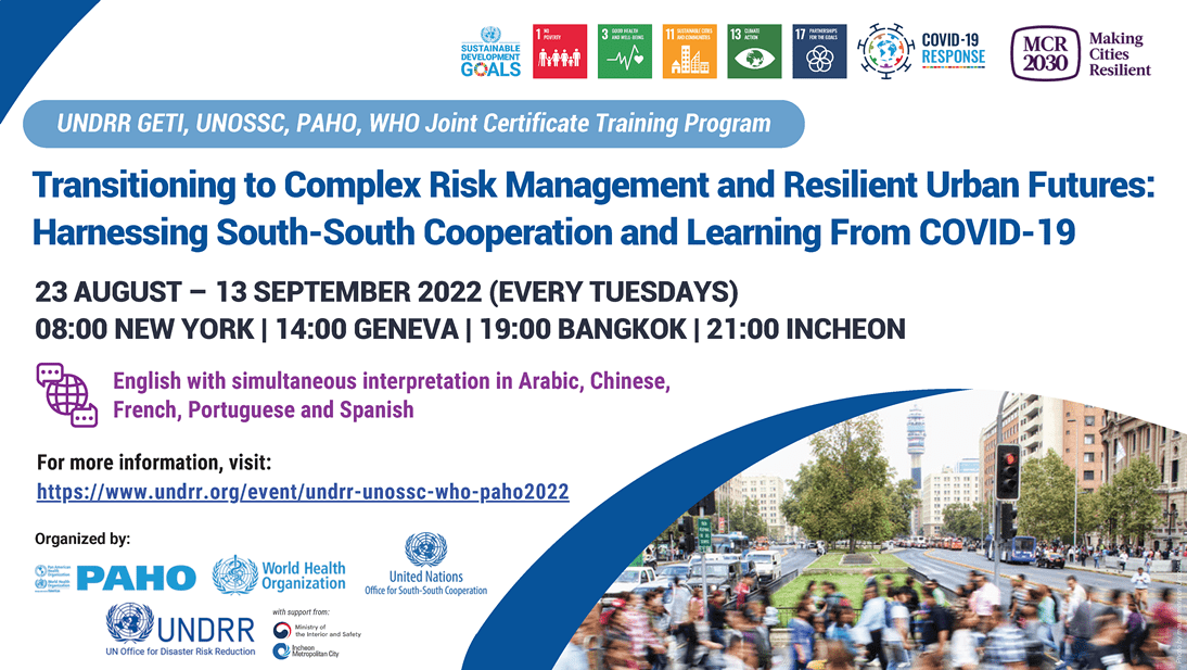 A joint certificate programme on “Transitioning to Complex Risk Management and Resilient Urban Futures: Harnessing South-South Cooperation and Learning From COVID-19”, will be held virtually from 23 August – 13 September 2022. It is organized by UNDRR Global Education and Training Institute (GETI), UN Office for South-South Cooperation (UNOSSC), World Health Organization (WHO) and Pan American Health Organization (PAHO), the course serves as an introductory training for urban leaders, planners, and practitioners, aiming to: