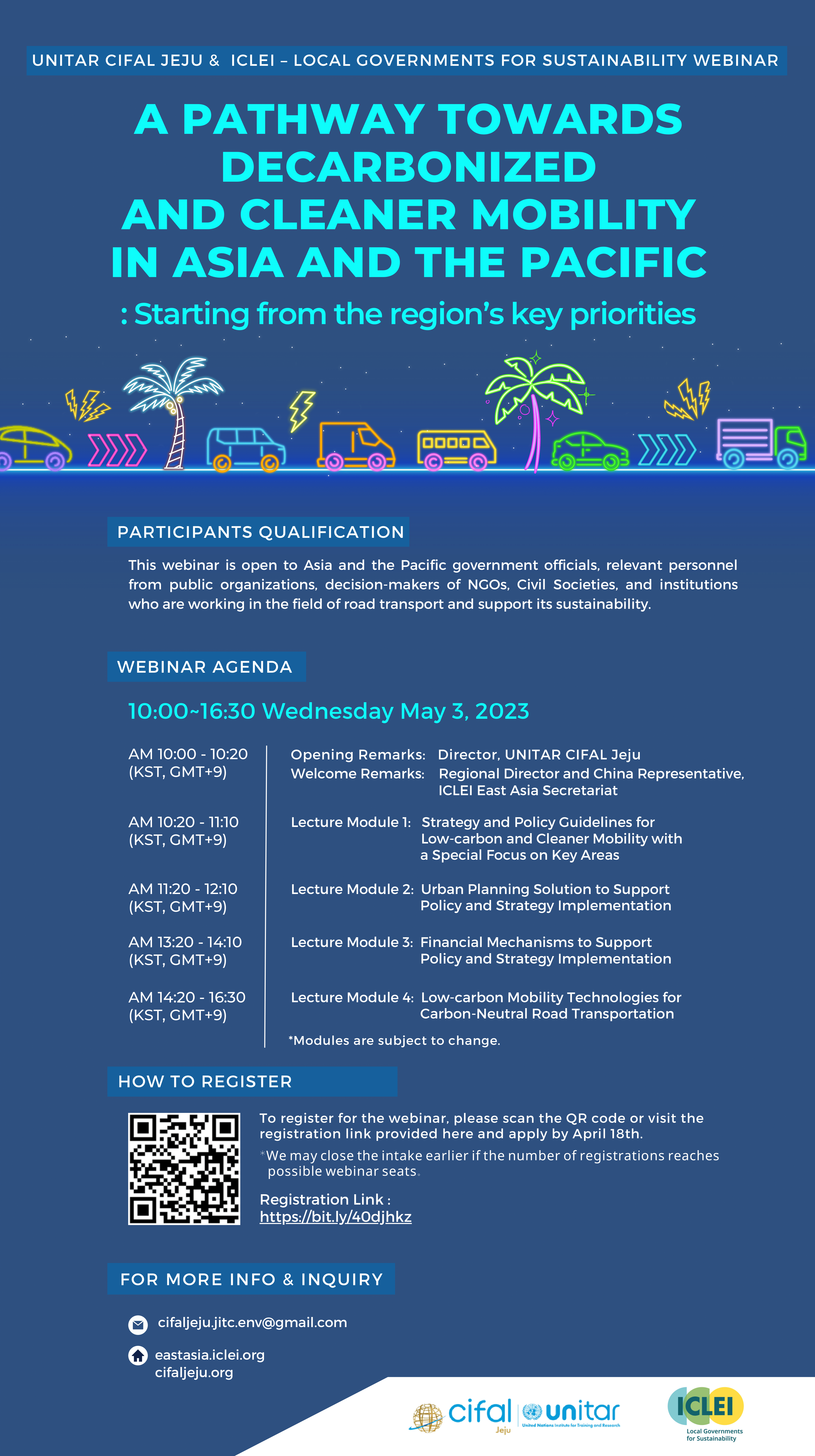 Hosted by UNITAR CIFAL Jeju and ICLEI – Local Governments for Sustainability, this hybrid webinar, which will take place on the second day of the workshop titled ‘A Pathway Towards Decarbonized and Cleaner Mobility in Asia and the Pacific: Starting from the Region’s Key Priorities’, will be held in conjunction with a policy conference of the 10th International Electric Vehicle Expo.