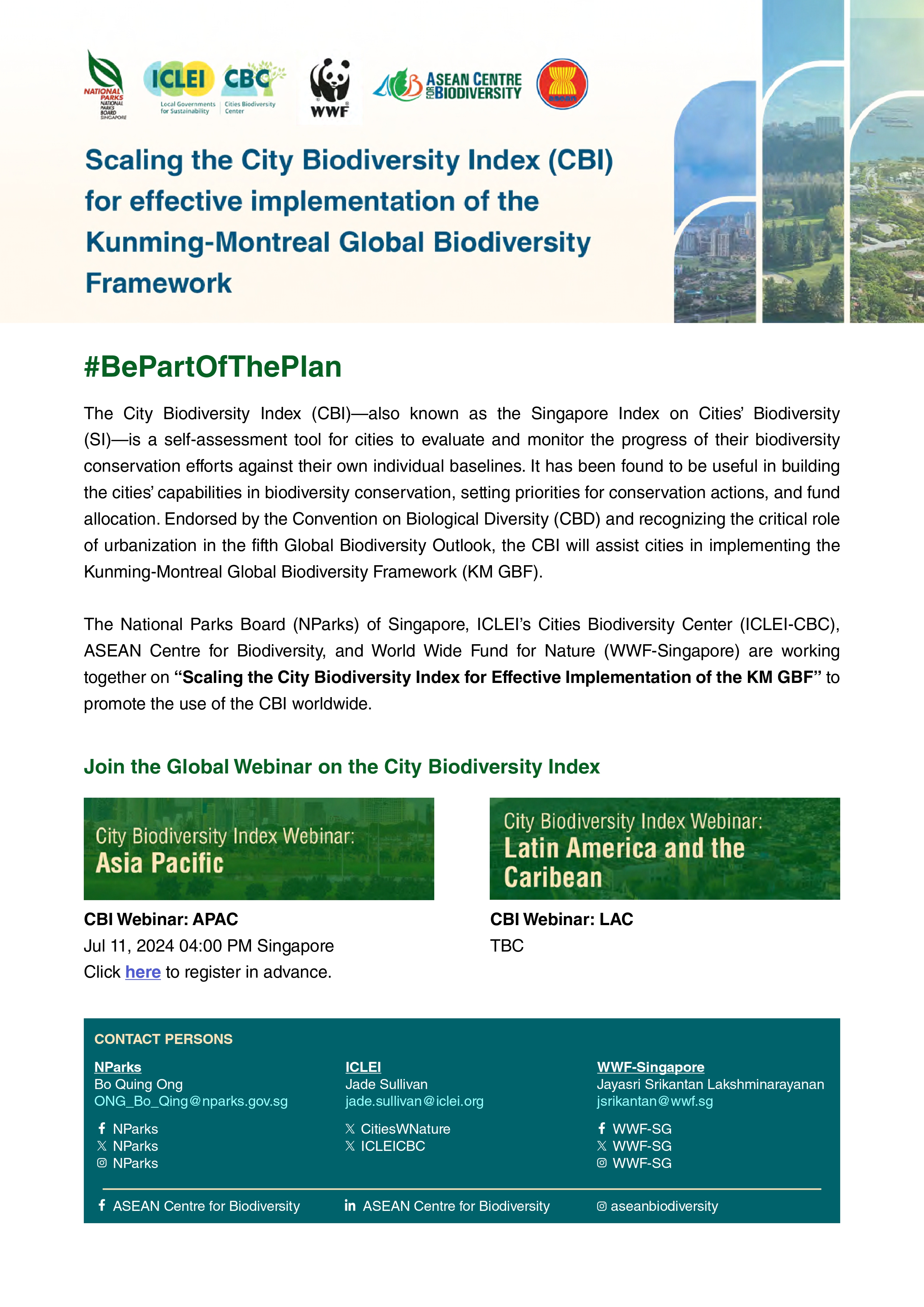 The National Parks Board (NParks) of Singapore, ICLEI’s Cities Biodiversity Center (ICLEI-CBC), ASEAN Centre for Biodiversity, and World Wide Fund for Nature (WWF-Singapore) are working together on “Scaling the City Biodiversity Index for Effective Implementation of the KM GBF” to promote the use of the CBI worldwide.