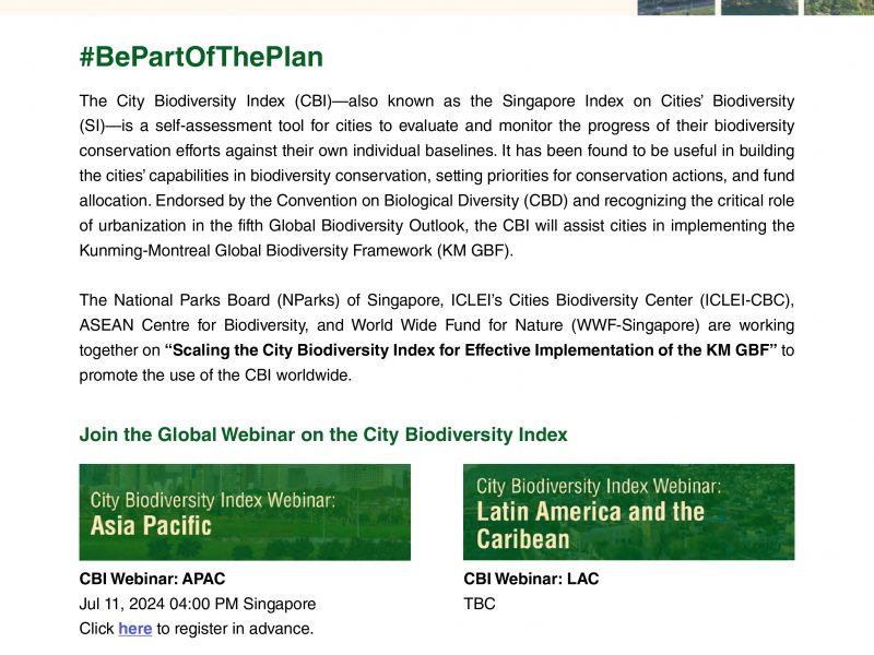 Posted by Chris Hidalgo on June 11, 2024The City Biodiversity Index (CBI)—also known as the Singapore Index on Cities’ Biodiversity (SI)—is a self-assessment tool for cities to evaluate and monitor the progress of their biodiversity conservation efforts against their own individual baselines. It has been found to be useful in building the cities’ capabilities in biodiversity conservation, setting priorities for conservation actions, […]