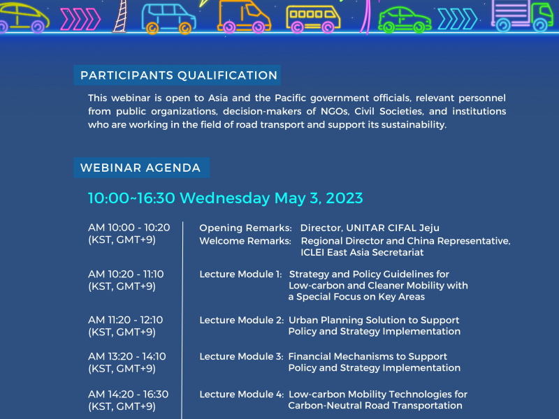 Posted by Chris Hidalgo on April 14, 2023Hosted by UNITAR CIFAL Jeju and ICLEI – Local Governments for Sustainability, this hybrid webinar, which will take place on the second day of the workshop titled ‘A Pathway Towards Decarbonized and Cleaner Mobility in Asia and the Pacific: Starting from the Region’s Key Priorities’, will be held in conjunction with a policy conference of the 10th […]